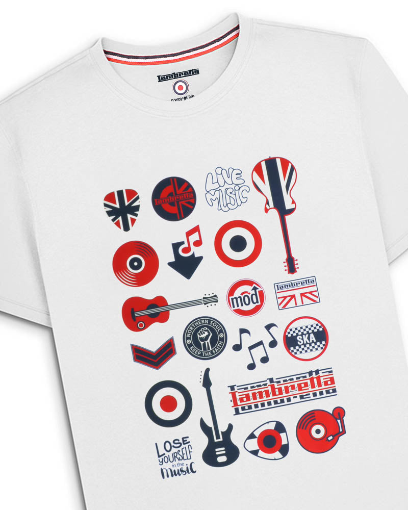 This tee showcases various music-inspired icons, paying tribute to our rich musical heritage. Made from 100% cotton for a comfortable fit and finished with embroidered branding on the sleeve.