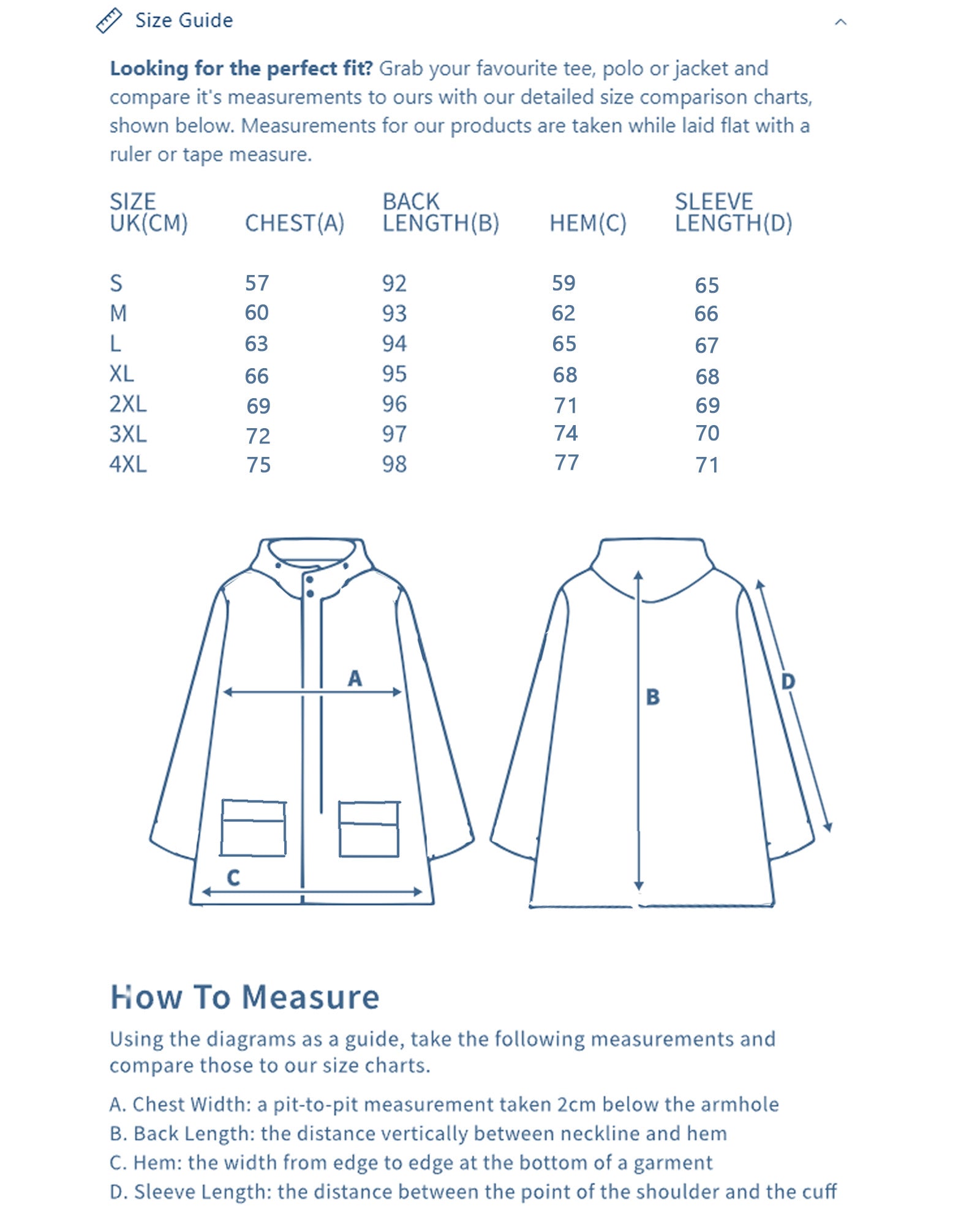 Looking for the perfect fit? Grab your favourite tee, polo or jacket and compare it's measurements to ours with our detailed size comparison charts, shown below. Measurements for our products are taken while laid flat with a ruler or tape measure.