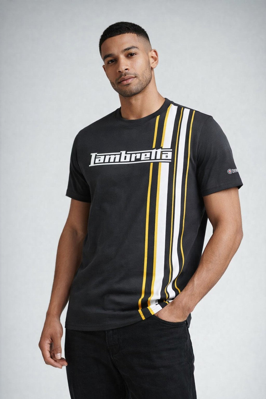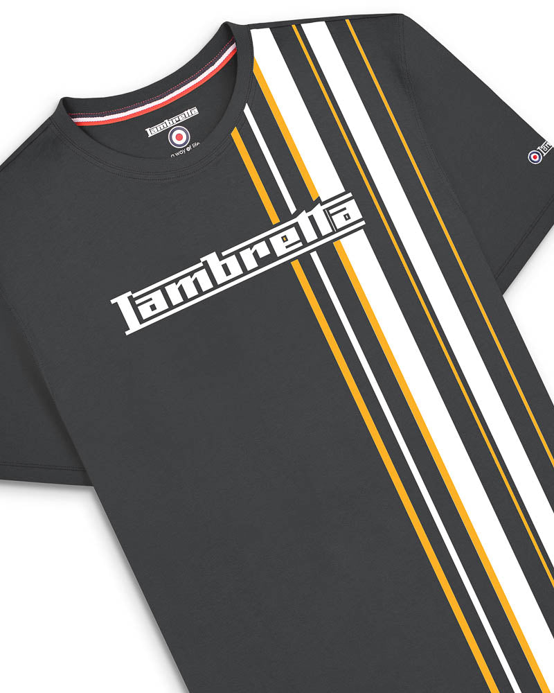 A cotton t-shirt featuring a graphic print which takes inspiration from the popular racing stripes used on scooters, making it a firm favourite for Lambretta fans.