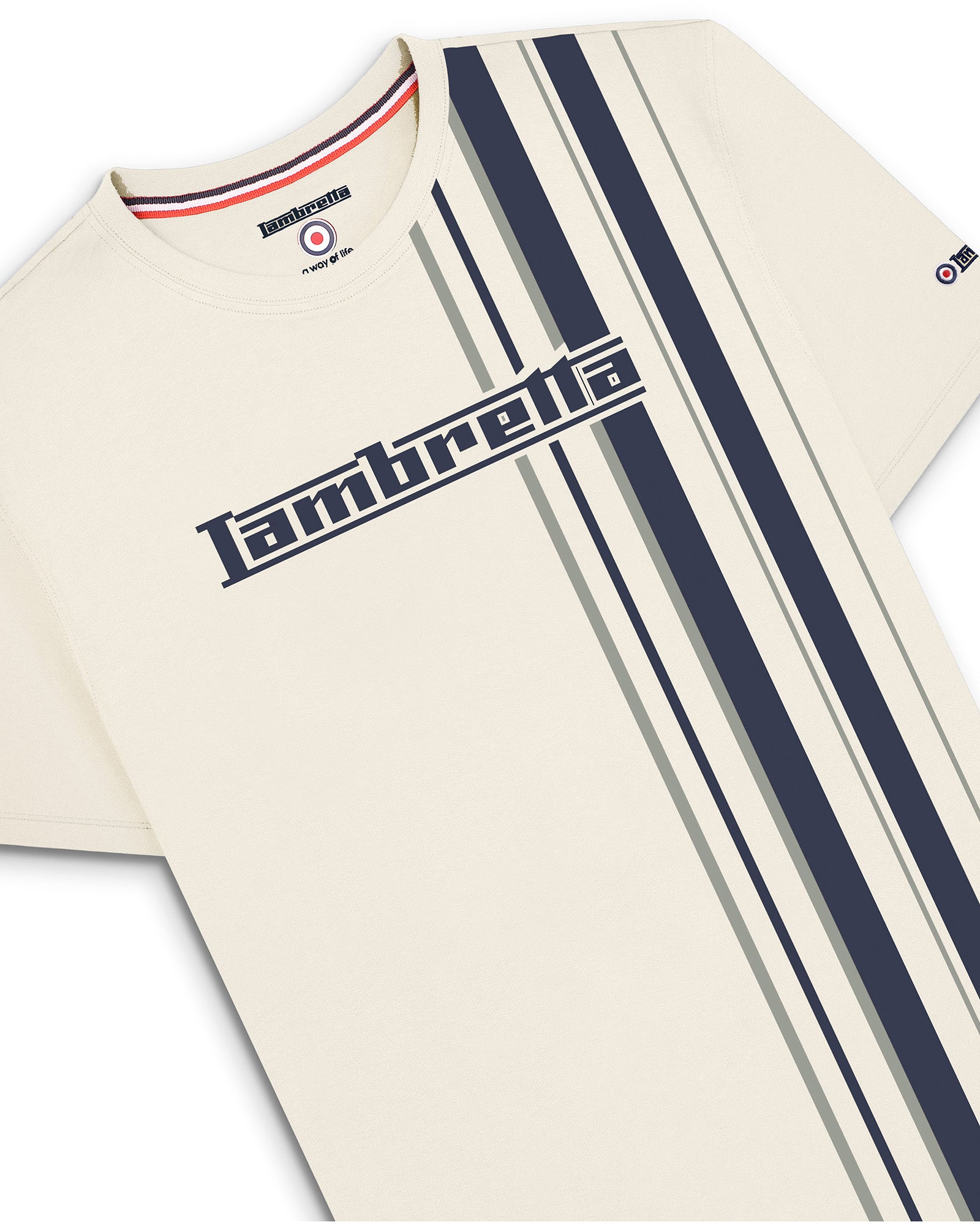 A cotton t-shirt featuring a graphic print which takes inspiration from the popular racing stripes used on scooters, making it a firm favourite for Lambretta fans.